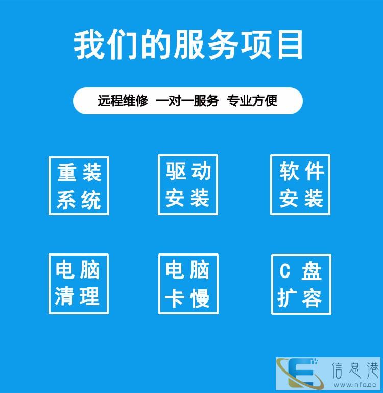 疫情期间,不能出门,无法提供上门维修服务,我们可以远程维修电脑,如果你的电脑出现以情况:需要重装系统,电脑卡慢,电脑中毒,安装驱动,安装软件,电脑清理,c盘清理,扩大分区容量,电脑没有声音等情况,我们可以远程解决,专业远程服务,一对一服务。8年实体老店,师傅有10年以上从业经历,专业快速,值得依赖。